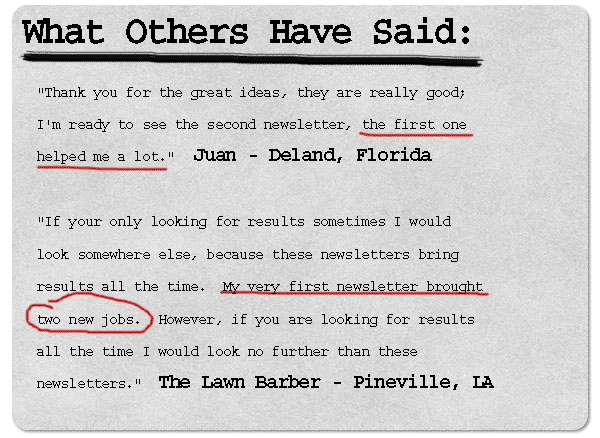 start getting a ton of new referrals and prospects. As I mentioned earlier my lawn company sales skyrocketed after I started sending a monthly newsletter.